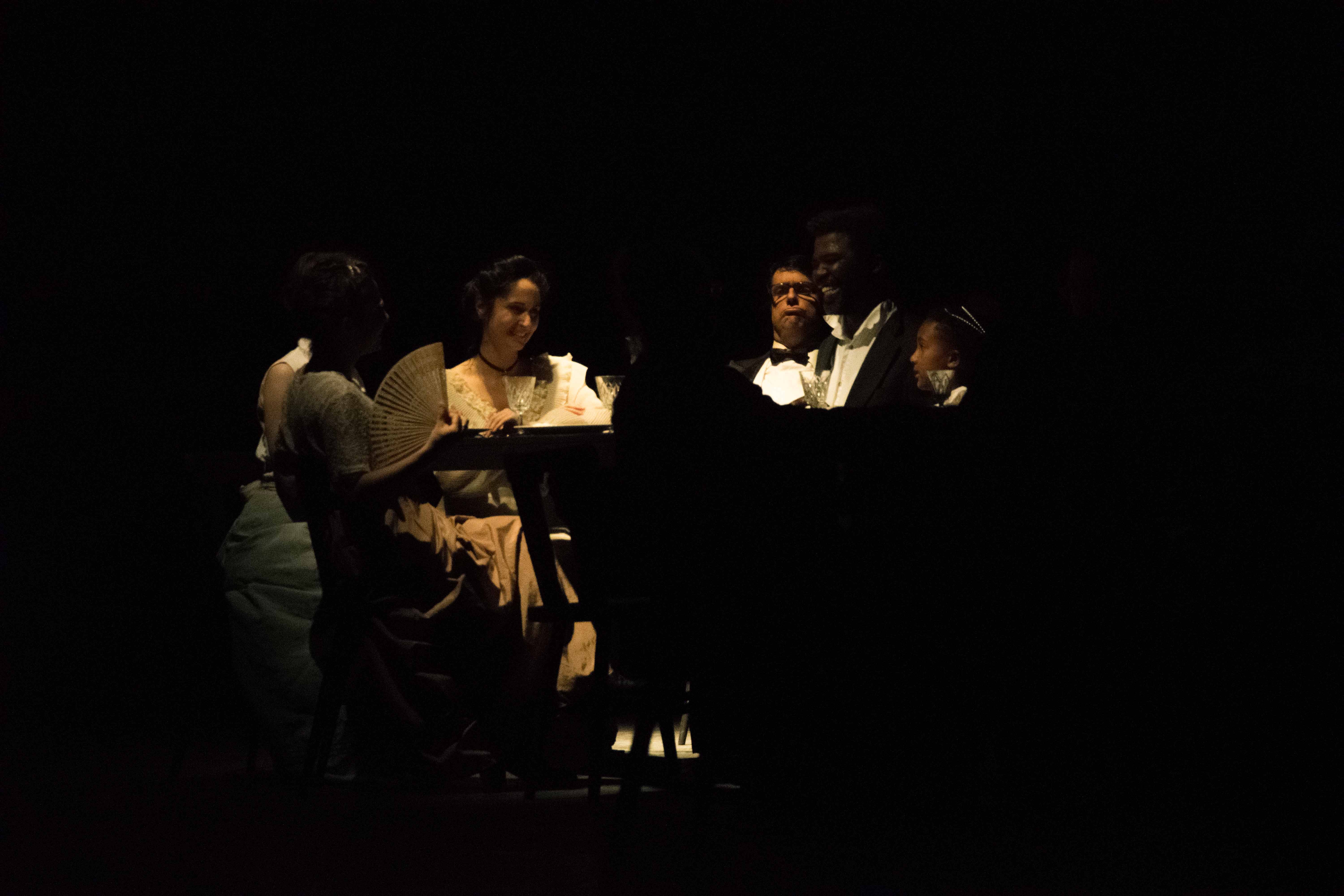 Comme il s'agissait d'une sorte de grand repas de famille cauchemardesque, j'ai fait émergé de l'obscurité quelques éléments symboliques de la salle à manger : Les tables, le vaisselier et les chaises étaient peints en noir de sorte que la vaisselle, la porte d'entrée et les comédiens semblaient presque flotter dans l'espace, comme un souvenir lointain et flou. L'espace est donc suggéré par les accessoires et les comédiens, en négatif. Une sorte de fine poussière recouvrait le sol, remuée progressivement par les scènes qui se succédaient comme si les personnages dépoussiéraient leurs souvenirs.