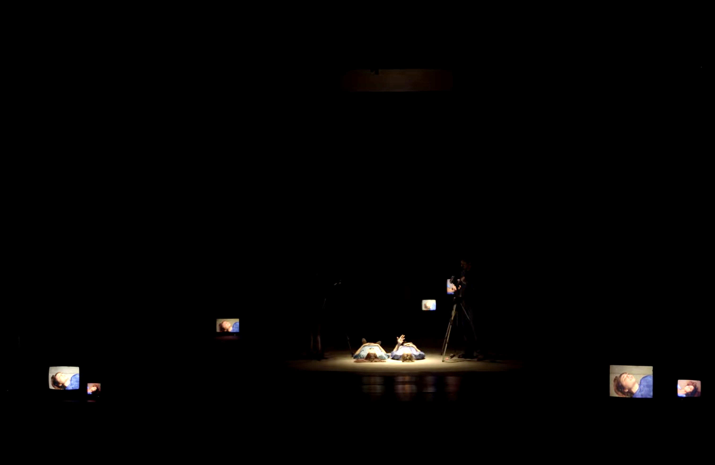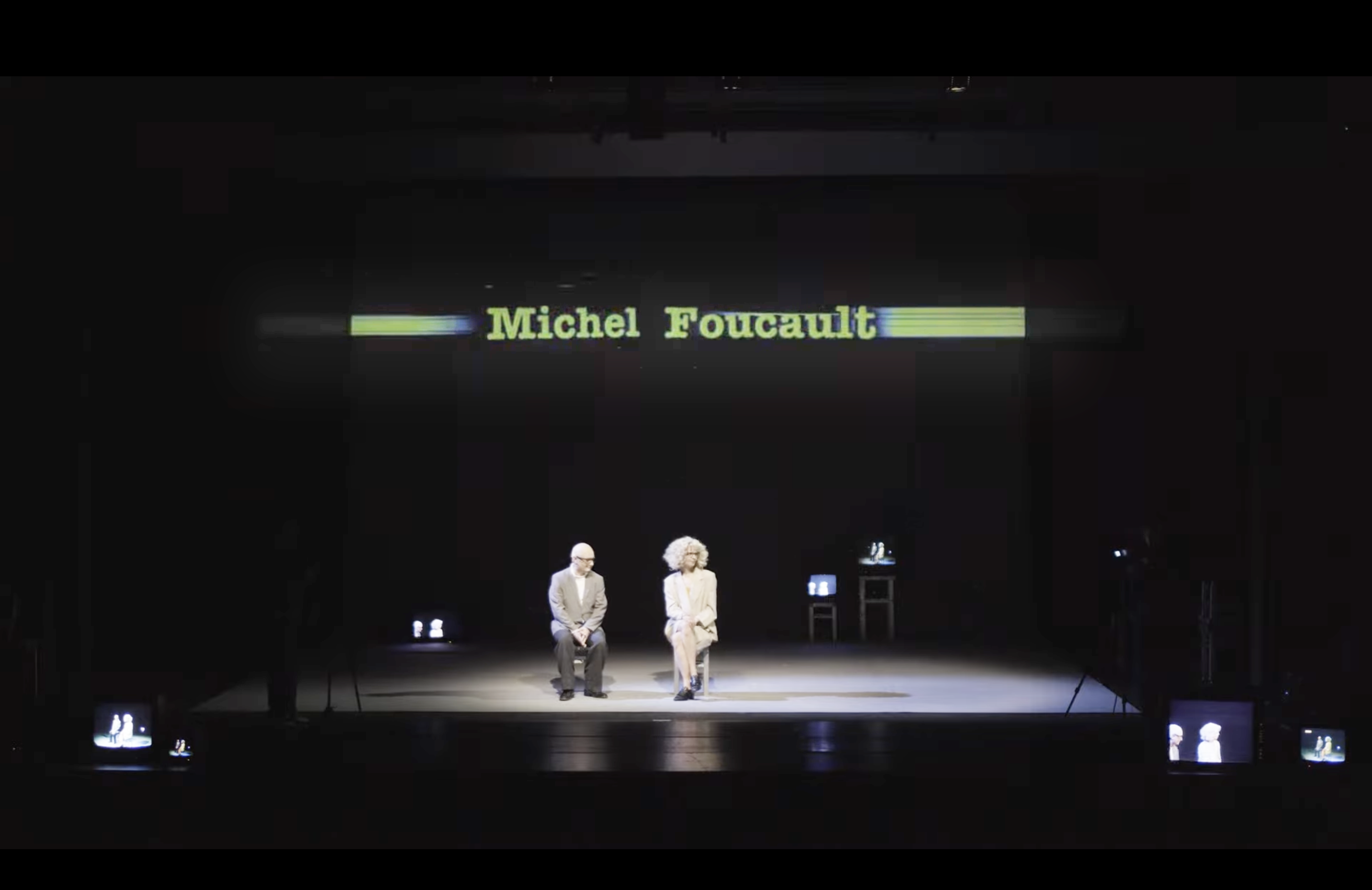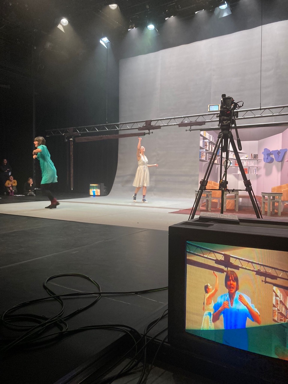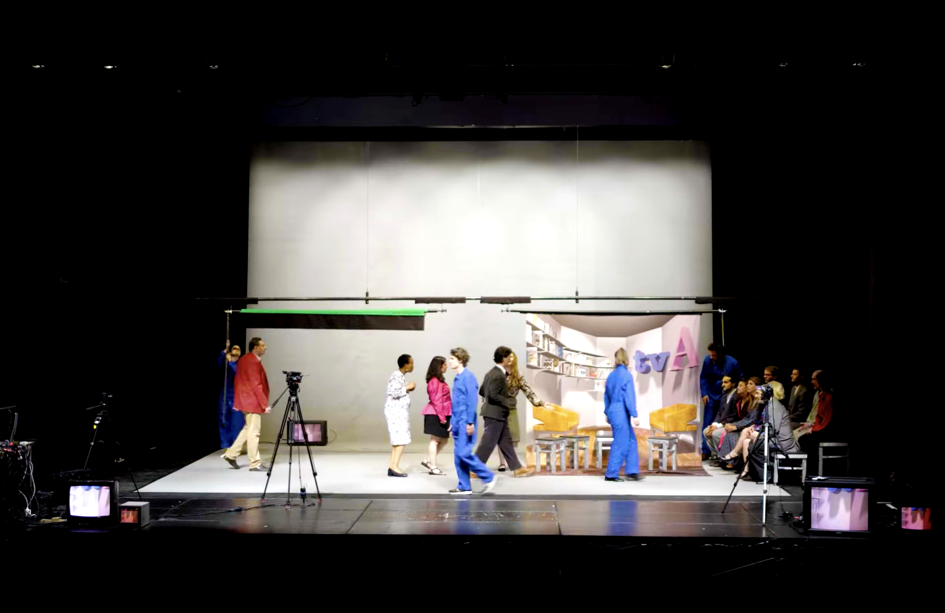 Ce spectacle convoquait des penseurs sur un plateau de télévision, multipliant les points de vue et les anachronismes. On m'a demandé un décor très adaptable, qui puisse disparaître en un clin d'oeil pour laisser place aux scènes chorégraphiques. J'ai donc proposé d'utiliser la mécanique scénique (les perches) et une technique de studio-photo à vue pour représenter le plateau de télévision. J'ai travaillé en étroite collaboration avec Aurélie Leporcq en charge de la technique vidéo pour installer de nombreuses télévisions cathodiques toutes liées à une table de mixage et manipulée en direct. Deux écrans déroulables de photographe permettaient de jouer toutes les scènes, l'un vert pour incruster une image de fond sur les différents postes de télévisions et l'autre imprimé d'une image en trompe-l'oeil que j'ai réalisé sur le logiciel "cinéma 4d" pour un effet plus faux que nature. De plus, nous avons utilisé un vidéo-projecteur pour surimprimer diverses images sur l'ensemble du cadre de scène : décor factice, neige de télévision, génériques, etc. Et enfin, j'ai contruit des bancs roulants de différentes dimensions pour permettre l'installation éclair d'un faux public sur scène.