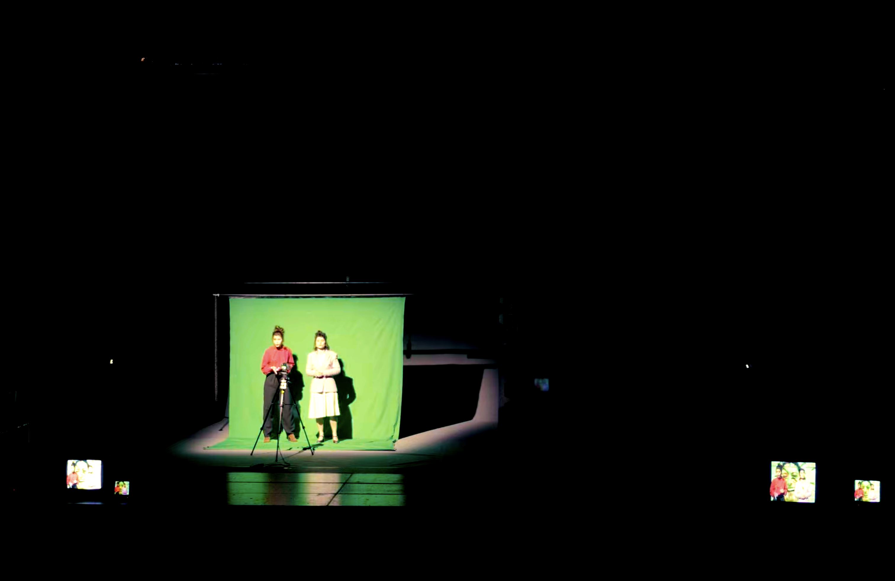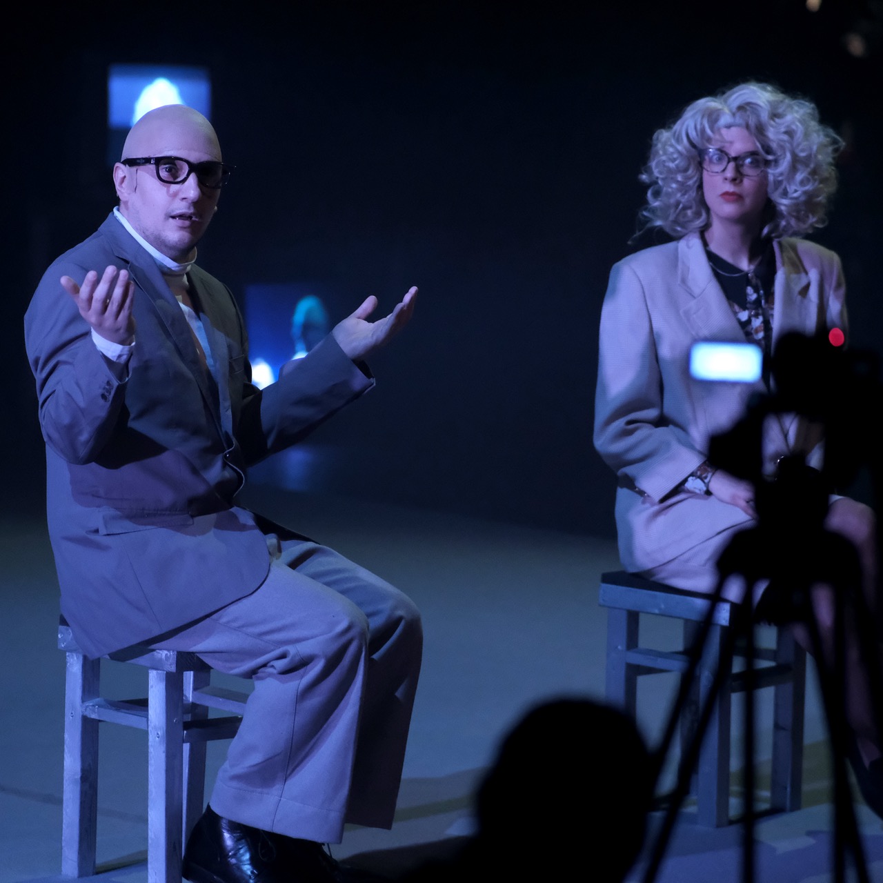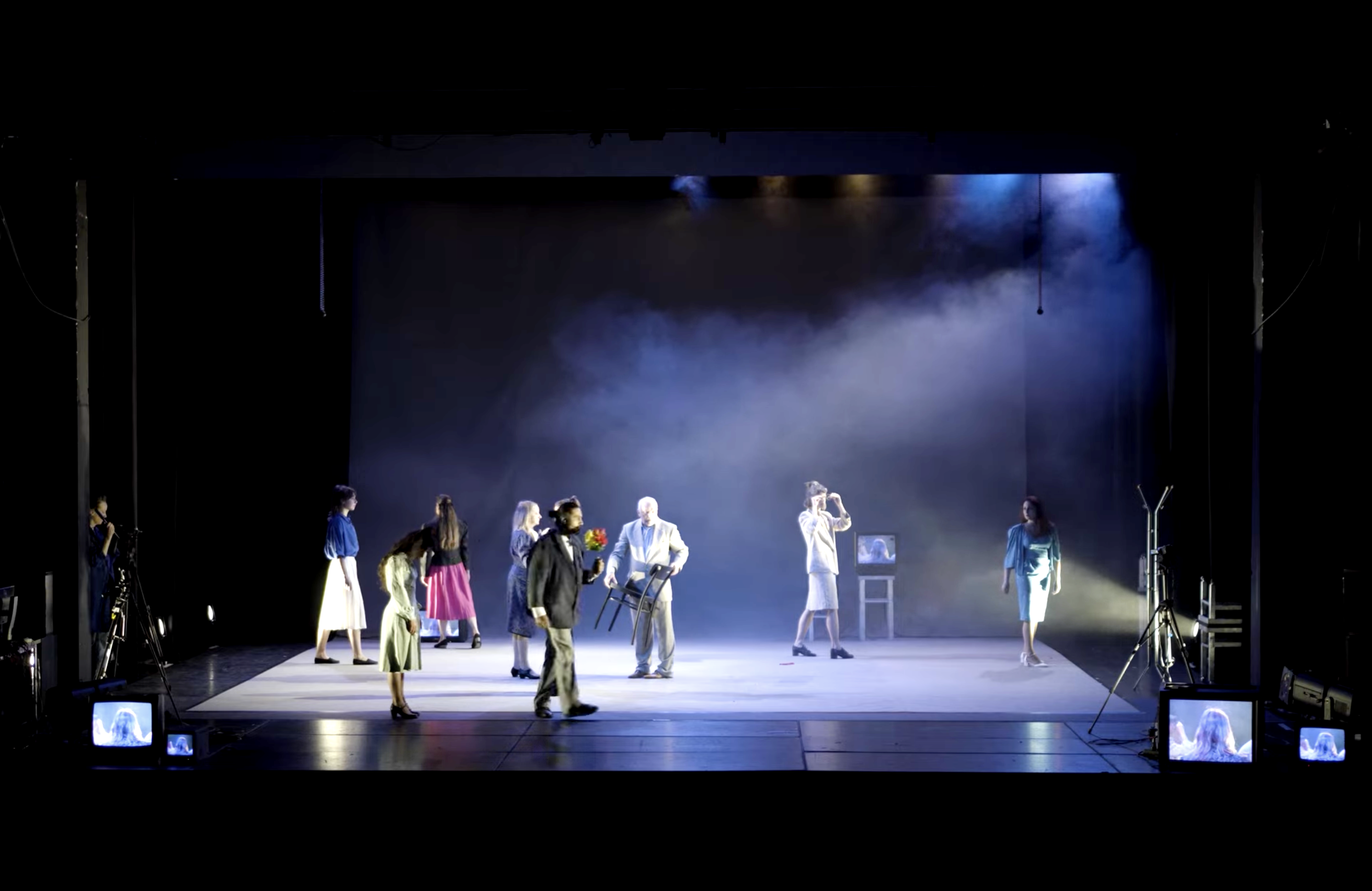 Ce spectacle convoquait des penseurs sur un plateau de télévision, multipliant les points de vue et les anachronismes. On m'a demandé un décor très adaptable, qui puisse disparaître en un clin d'oeil pour laisser place aux scènes chorégraphiques. J'ai donc proposé d'utiliser la mécanique scénique (les perches) et une technique de studio-photo à vue pour représenter le plateau de télévision. J'ai travaillé en étroite collaboration avec Aurélie Leporcq en charge de la technique vidéo pour installer de nombreuses télévisions cathodiques toutes liées à une table de mixage et manipulée en direct. Deux écrans déroulables de photographe permettaient de jouer toutes les scènes, l'un vert pour incruster une image de fond sur les différents postes de télévisions et l'autre imprimé d'une image en trompe-l'oeil que j'ai réalisé sur le logiciel "cinéma 4d" pour un effet plus faux que nature. De plus, nous avons utilisé un vidéo-projecteur pour surimprimer diverses images sur l'ensemble du cadre de scène : décor factice, neige de télévision, génériques, etc. Et enfin, j'ai contruit des bancs roulants de différentes dimensions pour permettre l'installation éclair d'un faux public sur scène.