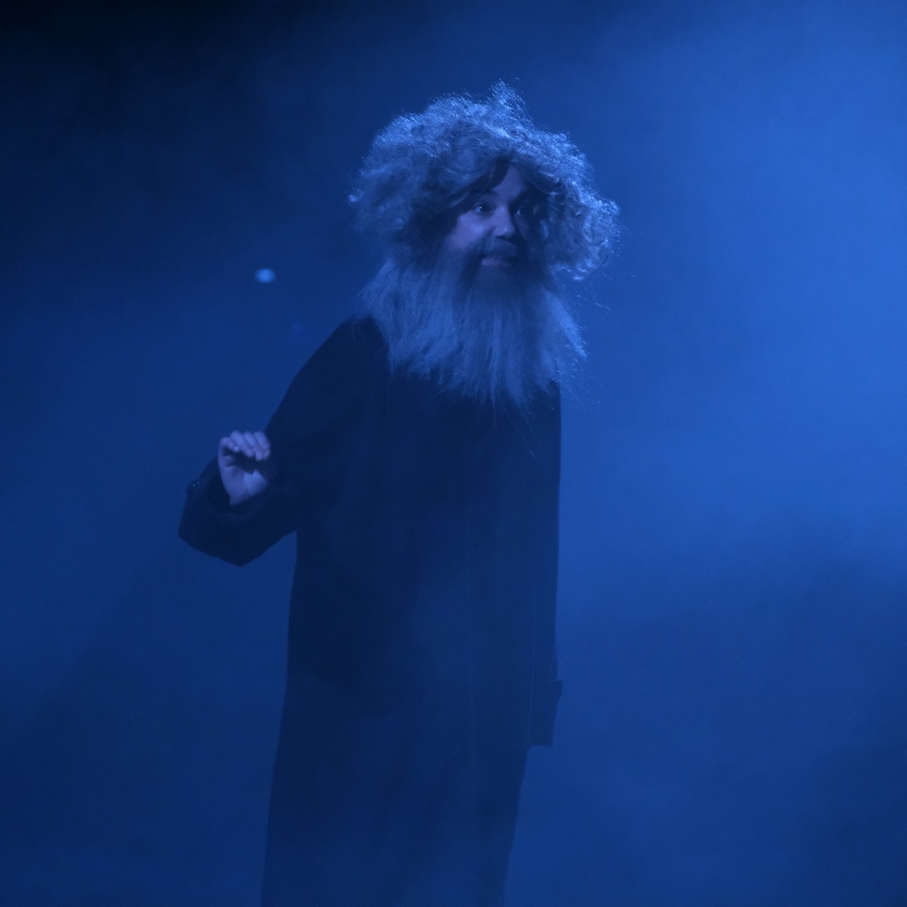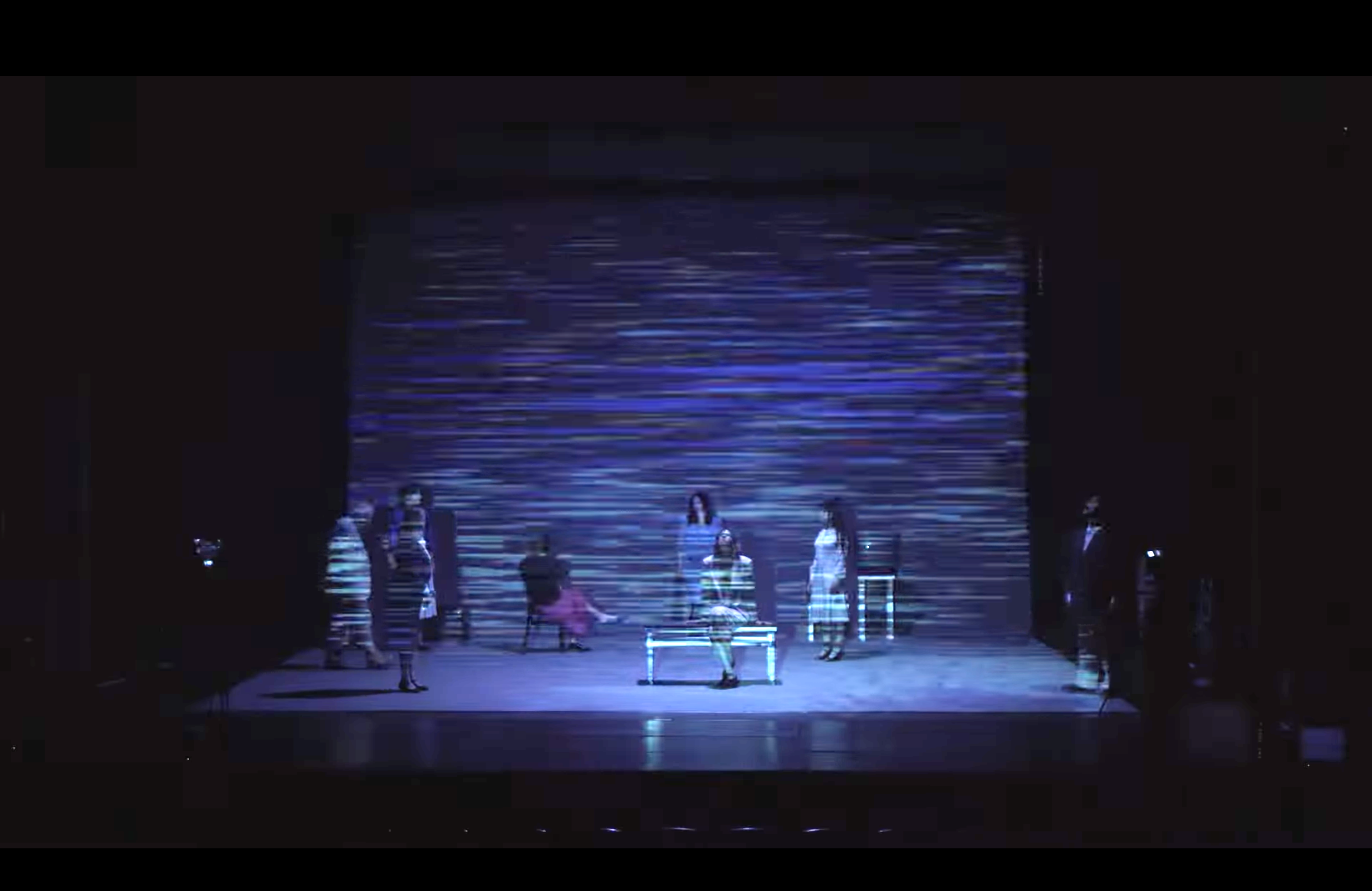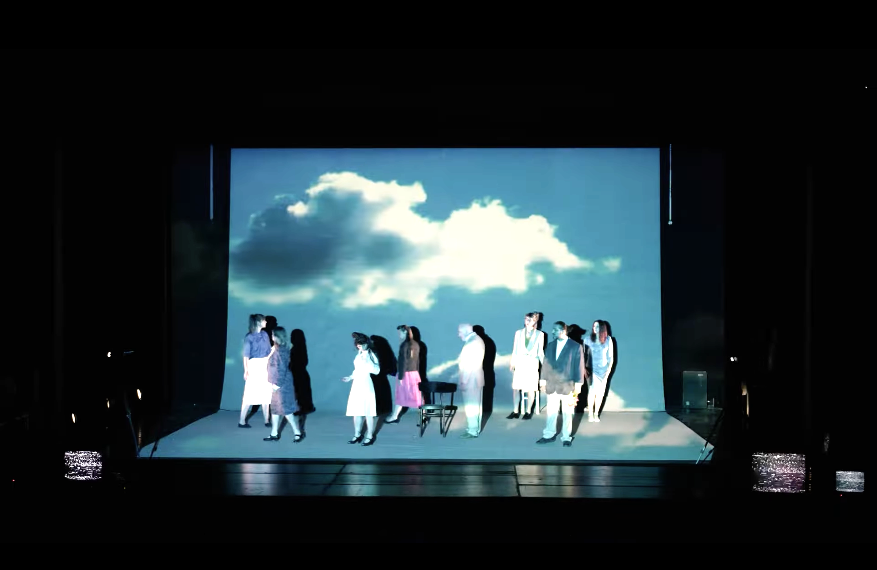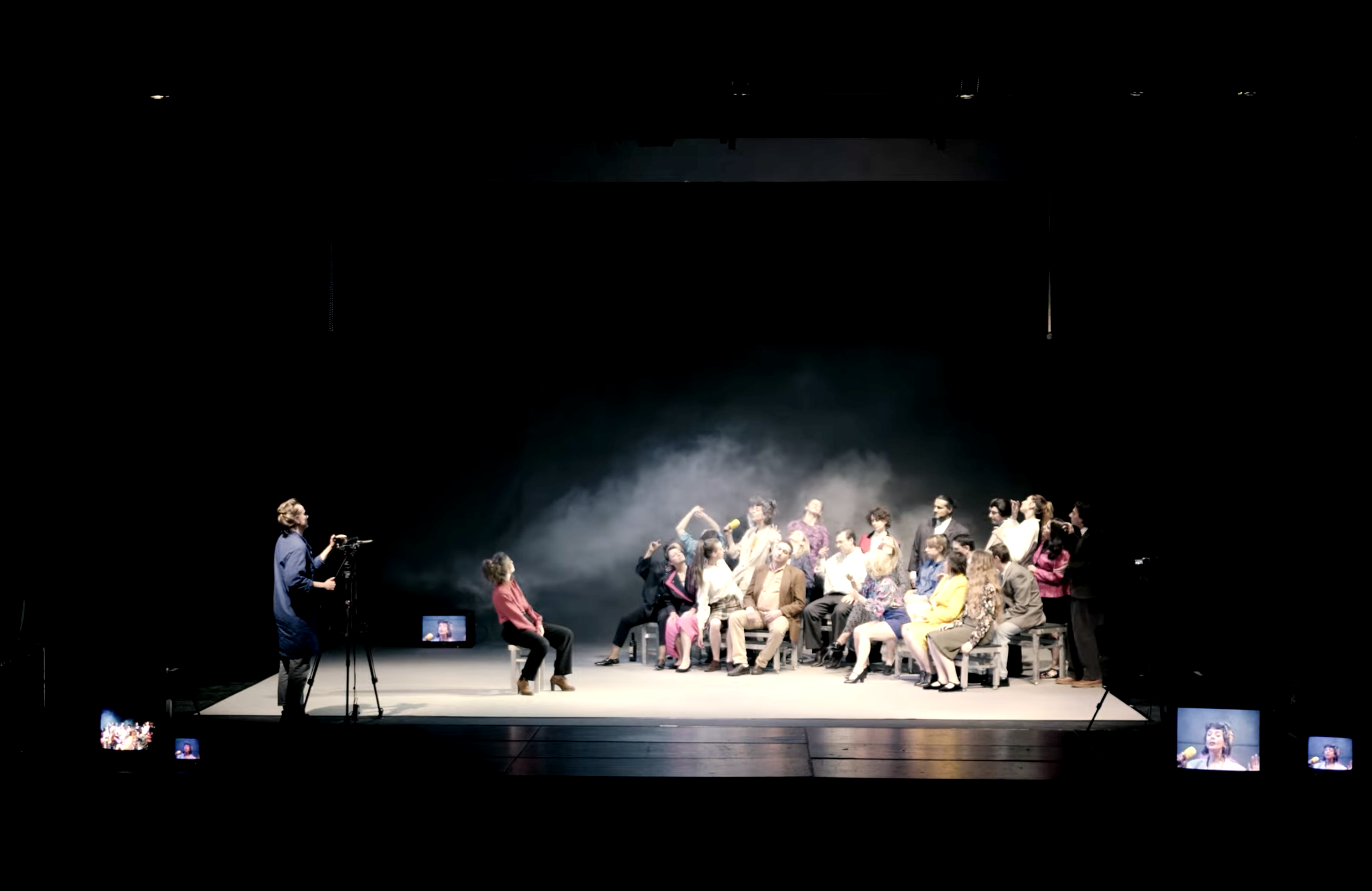 Ce spectacle convoquait des penseurs sur un plateau de télévision, multipliant les points de vue et les anachronismes. On m'a demandé un décor très adaptable, qui puisse disparaître en un clin d'oeil pour laisser place aux scènes chorégraphiques. J'ai donc proposé d'utiliser la mécanique scénique (les perches) et une technique de studio-photo à vue pour représenter le plateau de télévision. J'ai travaillé en étroite collaboration avec Aurélie Leporcq en charge de la technique vidéo pour installer de nombreuses télévisions cathodiques toutes liées à une table de mixage et manipulée en direct. Deux écrans déroulables de photographe permettaient de jouer toutes les scènes, l'un vert pour incruster une image de fond sur les différents postes de télévisions et l'autre imprimé d'une image en trompe-l'oeil que j'ai réalisé sur le logiciel "cinéma 4d" pour un effet plus faux que nature. De plus, nous avons utilisé un vidéo-projecteur pour surimprimer diverses images sur l'ensemble du cadre de scène : décor factice, neige de télévision, génériques, etc. Et enfin, j'ai contruit des bancs roulants de différentes dimensions pour permettre l'installation éclair d'un faux public sur scène.