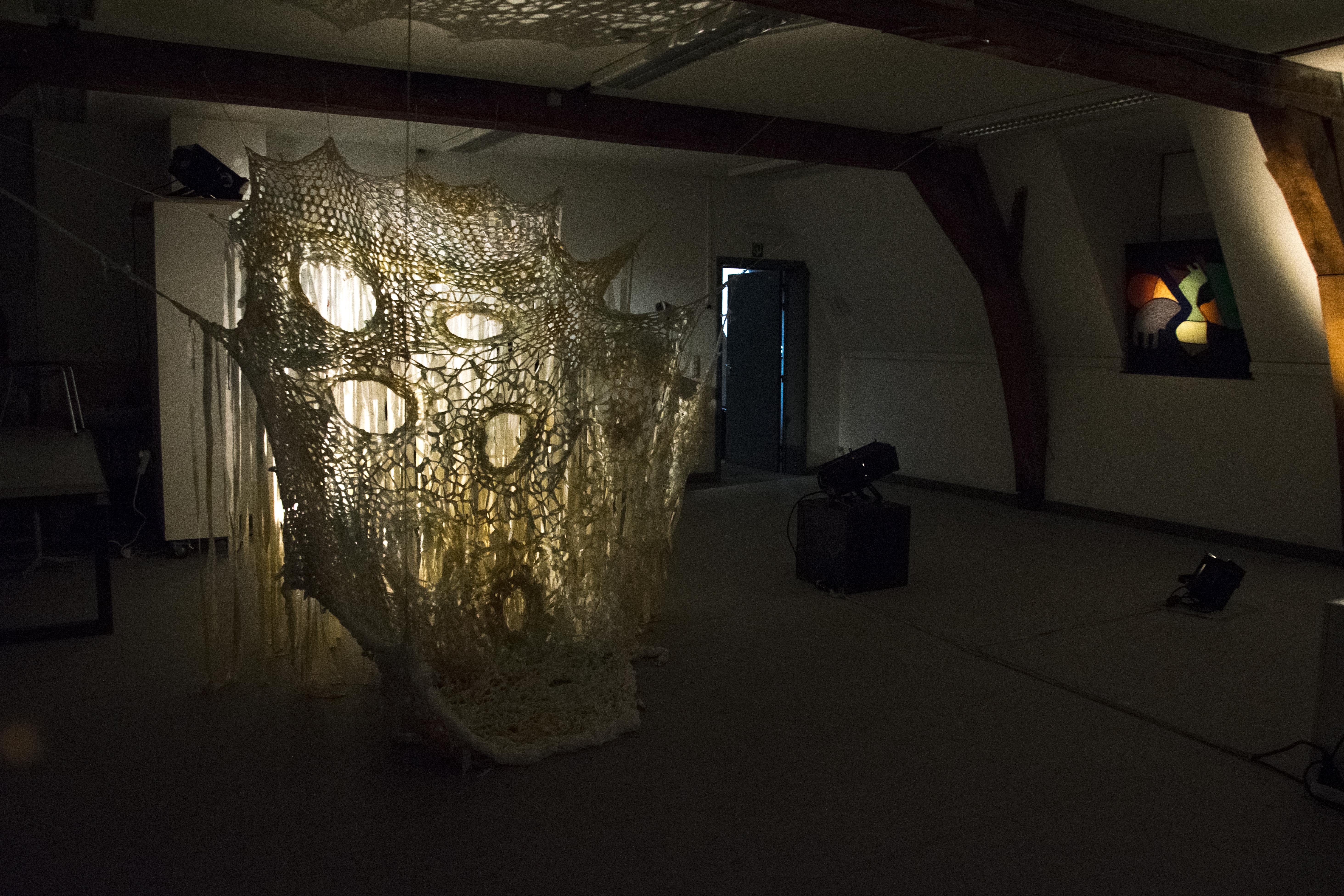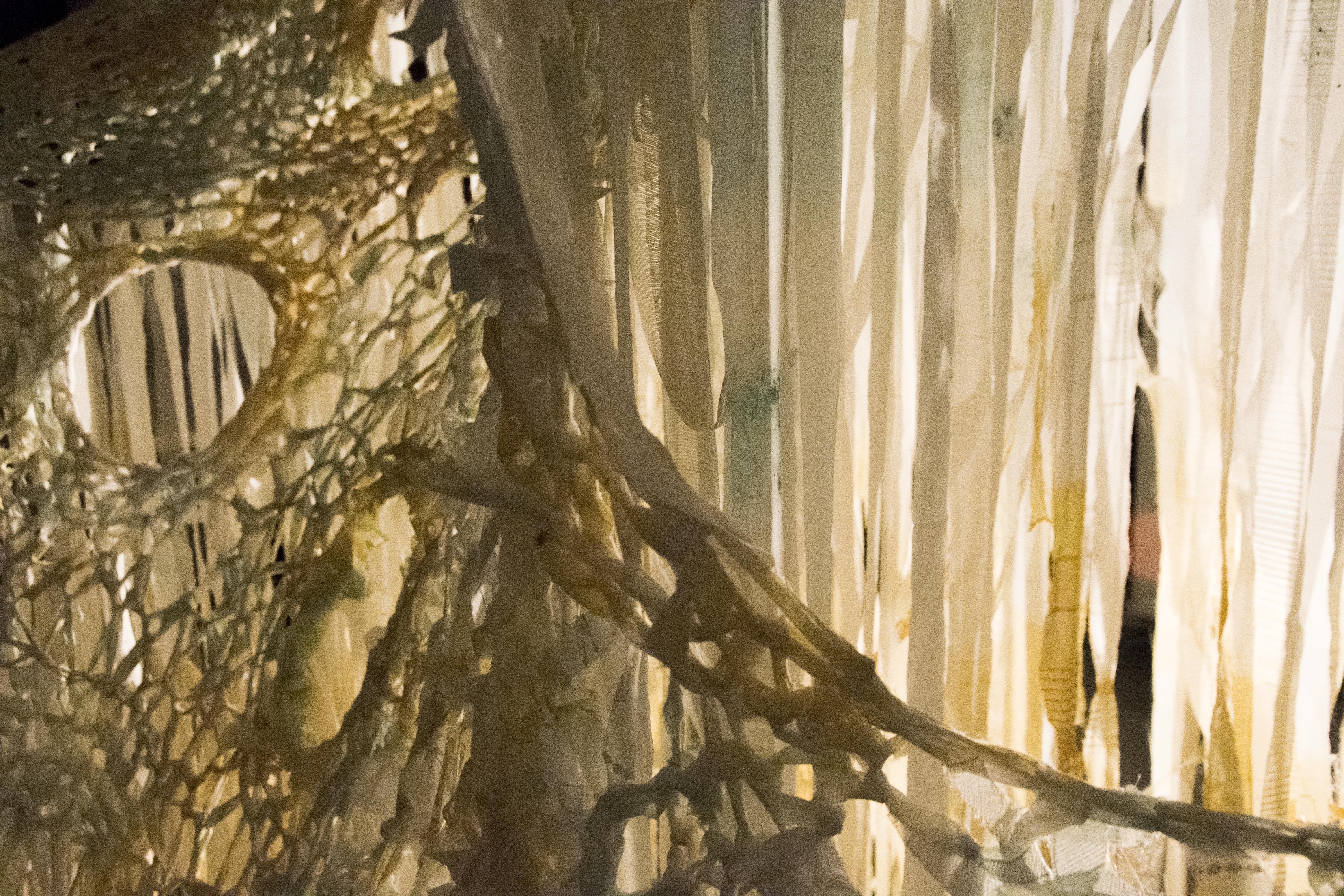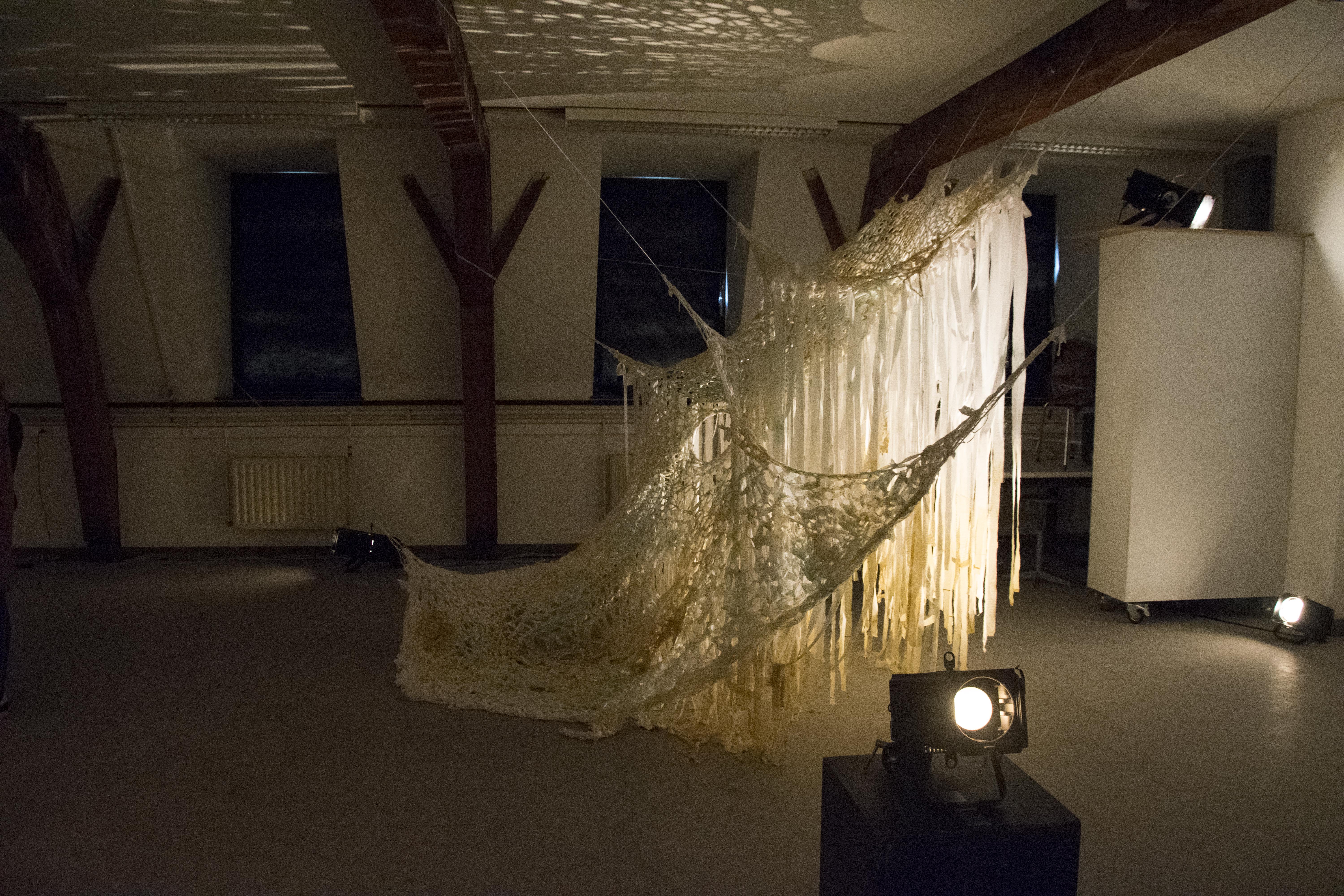 Cette installation imite une vague qui s’élève. Entre le sol et la vague, se trouve la limite que l’on hésite à traverser dans nos rêves. J’ai travaillé sur le profond et mystérieux archétype de l'océan dans l’inconscient collectif. La vague est figée dans son mouvement, on peut tourner autour et l'observer comme un objet de curiosité, pénétrer ses entrailles sans crainte, et en sortir sans difficulté. Alors, peut-être sera-t-il plus facile de traverser la limite la nuit?